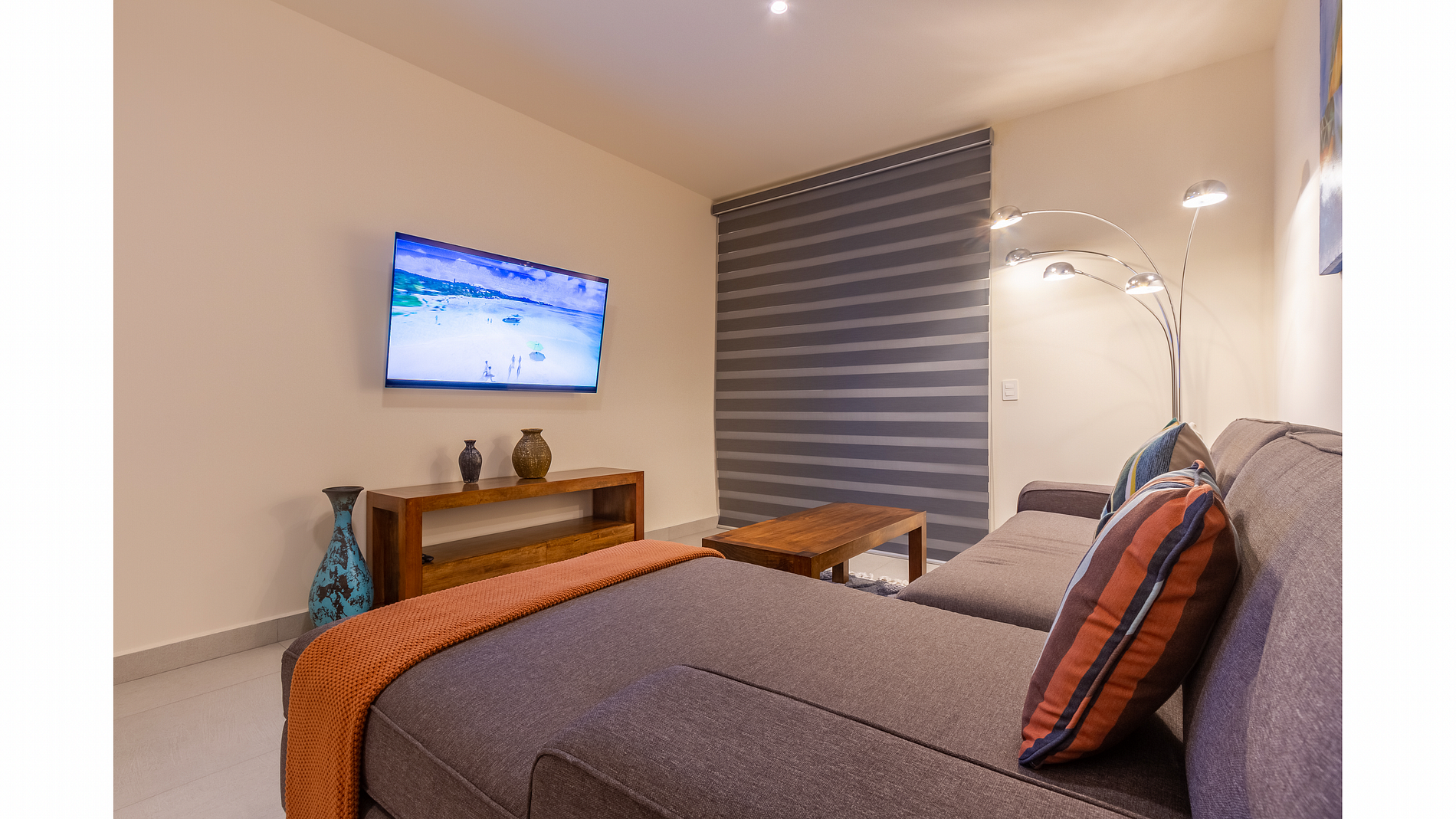 Disfruta de una sala de estar luminosa y ventilada, con un sofá cómodo y Smart TV, ideal para descansar después de un día en la playa. Abre las puertas de vidrio y sal a tu balcón privado con mobiliario, perfecto para un café por la mañana o una copa al atardecer