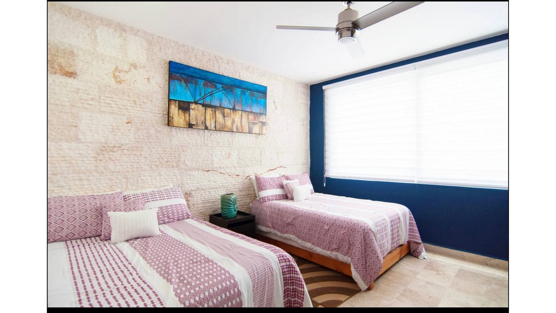 Disfruta tu café de la mañana en el balcón con vista a la alberca, luego prepara tu bolso de playa y camina solo 50 metros hasta Playa Mamitas, ¡la más popular de Playa del Carmen! Relájate con el sonido de las olas del Caribe y música lounge en Mamitas, Kool Beach Club o Coralina, mientras conoces a otros viajeros de todo el mundo. Este moderno departamento en el segundo piso de 2 recámaras y 2.5 baños tiene todo lo que necesitas para unas vacaciones inolvidables: * Amplio balcón con camastros * Recámara principal: cama king, vestidor y baño completo * Segunda recámara: 2 camas matrimoniales y baño completo * Medio baño adicional * Sala y comedor con mucha luz, 3 sofás y mesa para 6 personas * Cocina equipada con electrodomésticos de acero inoxidable y barra desayunadora * Aire acondicionado, ventiladores de techo, WiFi, sábanas y toallas incluidas * Refrescante alberca compartida Ideal para familias, amigos o parejas que buscan comodidad, ubicación y estilo.