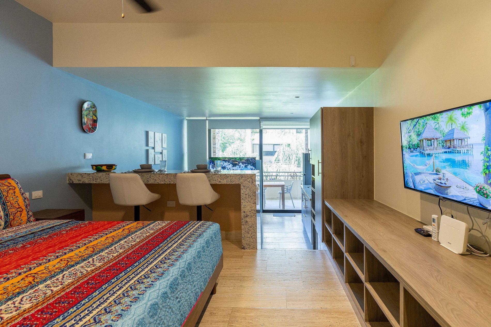 Estarás ubicado en el corazón de Playa del Carmen, a solo unos pasos de la emblemática Quinta Avenida y a corta distancia caminando de la playa. Esta ubicación privilegiada te permite disfrutar fácilmente de una gran variedad de restaurantes, cafés, tiendas, supermercados como Walmart, y transporte público para explorar toda la zona con comodidad. Nuestro estudio ofrece un diseño moderno y funcional que combina estilo y confort, ideal para quienes buscan una experiencia relajada y práctica en el Caribe Mexicano.