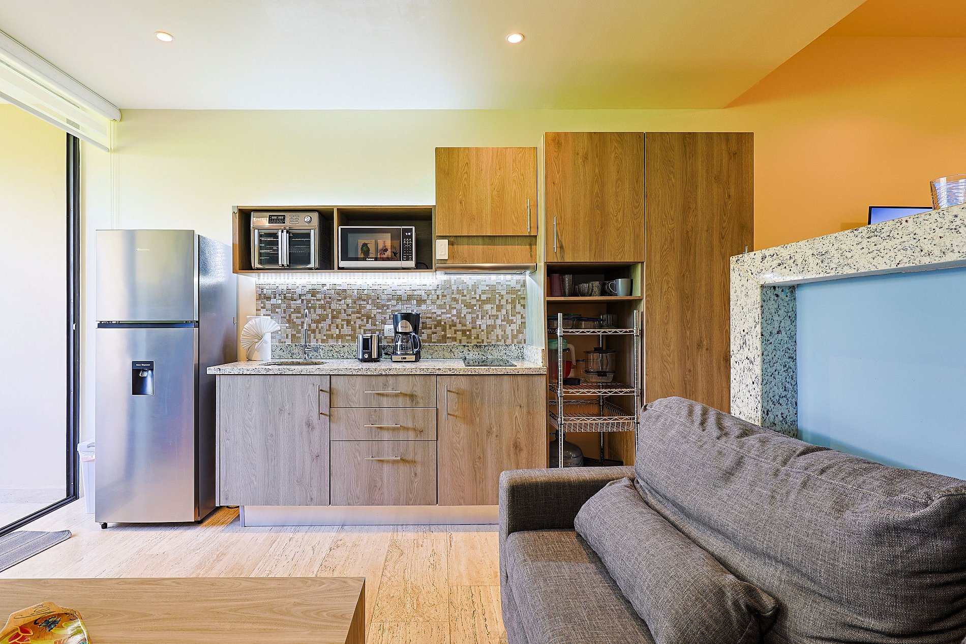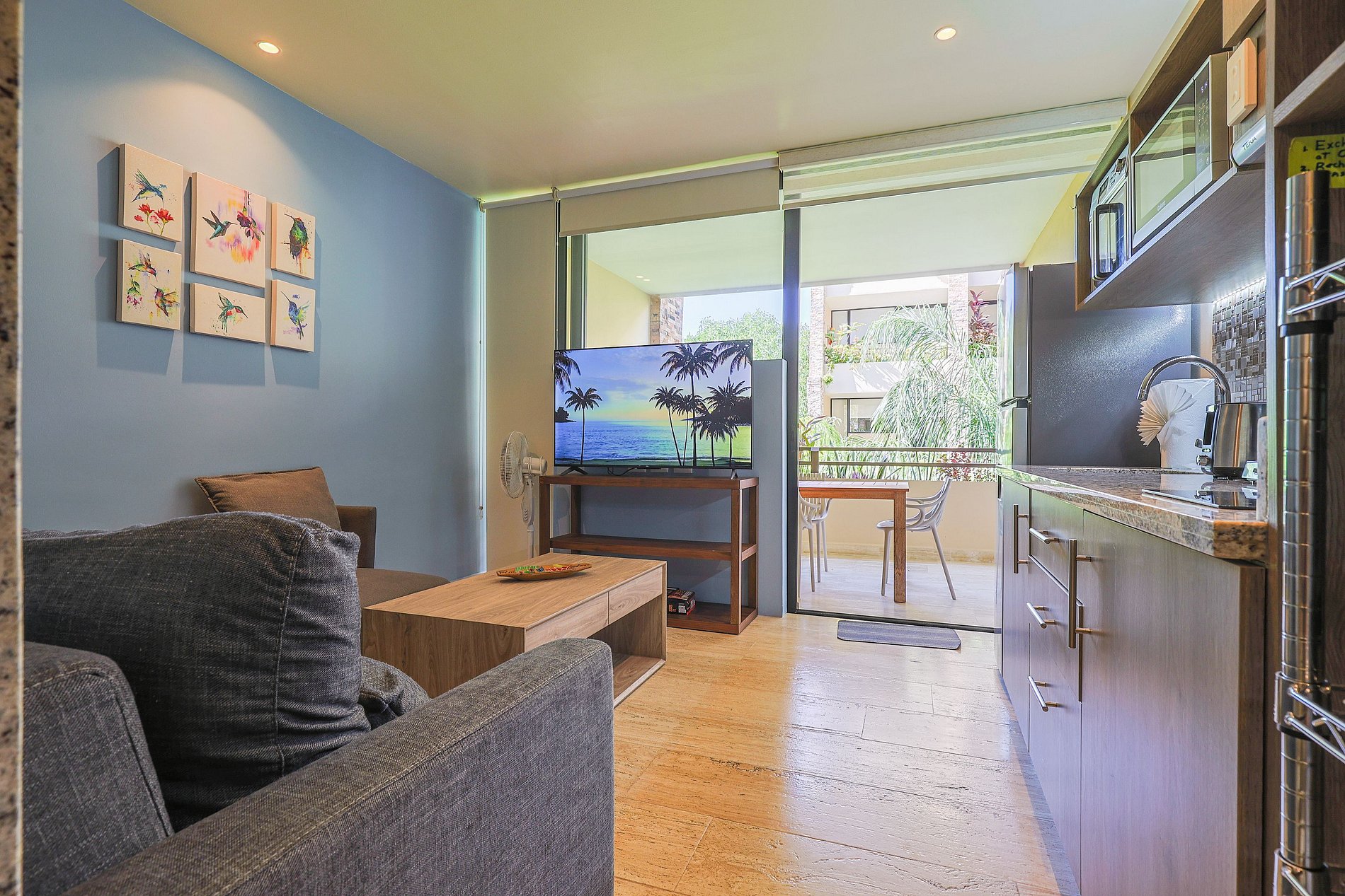 El espacio destaca por su ambiente minimalista y acogedor, con una sala hundida que crea una división natural entre las áreas de descanso y cocina, además de un balcón privado perfecto para relajarte mientras disfrutas del clima tropical.