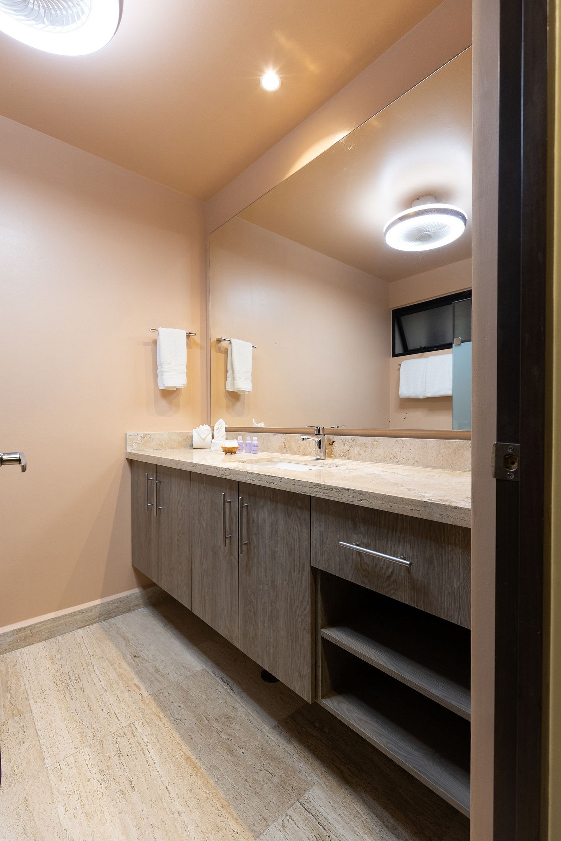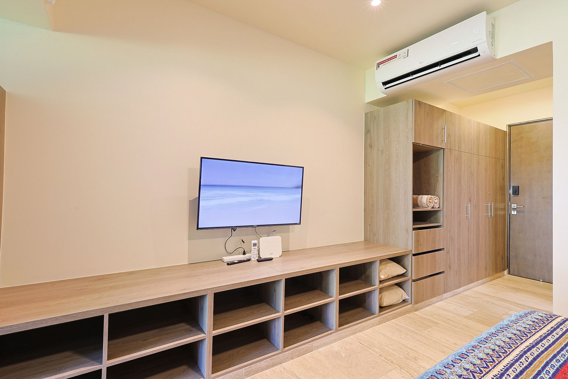 Diseño moderno y minimalista con una sala hundida que separa elegantemente la cocina y el área de descanso. La sala tiene acceso directo a un balcón privado, ideal para relajarte entre días de playa y exploraciones por la ciudad. Cuenta con un sofá cama doble y dos Smart TVs para entretenimiento o noches tranquilas.