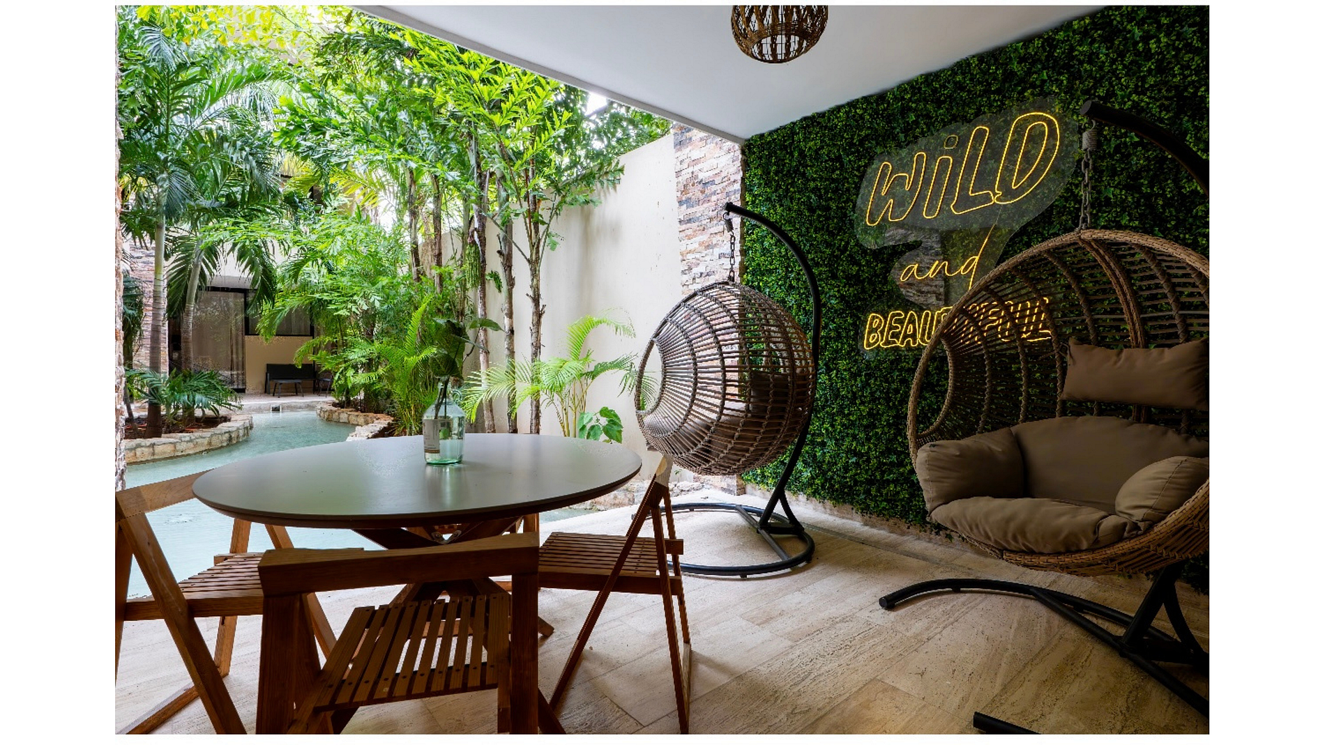 Una amplia área de bar ofrece suficiente espacio para comer o trabajar, mientras que un gran patio rodeado por un tranquilo estanque y un paisaje tropical te invita a disfrutar de cenas al aire libre y momentos de relajación.